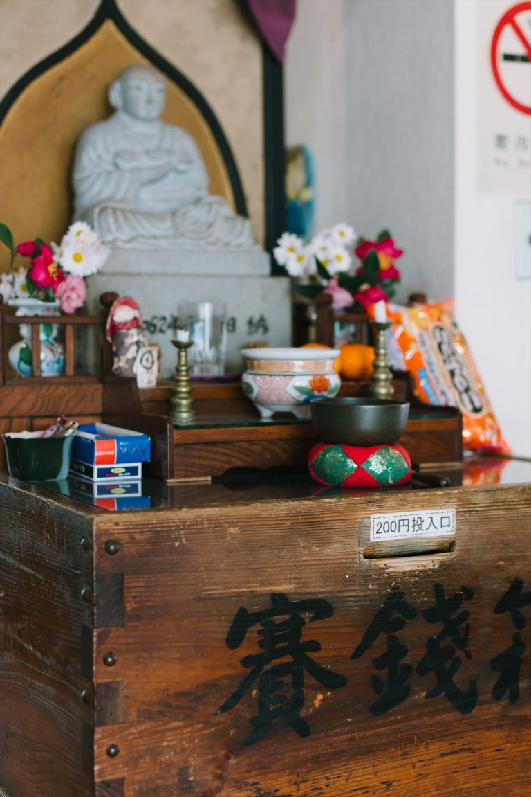 温泉の守り神である薬師如来像の前にある賽銭箱に200円を入れて利用するスタイルが、どこか懐かしさを感じさせます。
