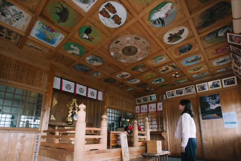山の斜面に建てられた社殿は、なぜここに?と思ってしまう場所にあるばかりでなく、内部の天井に飾られた絵馬も見事です。