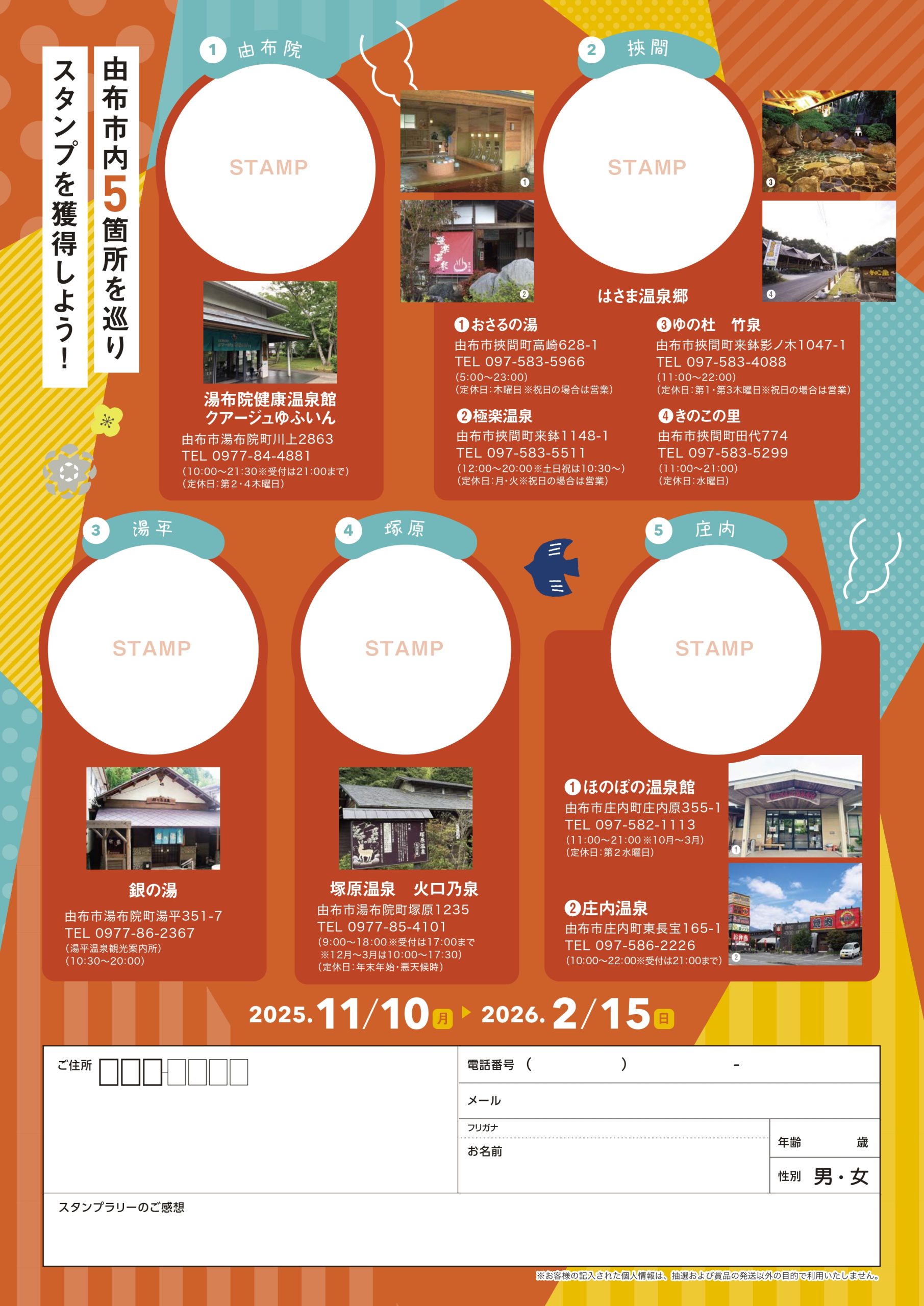 第2弾では由布市内5地域の温泉施設が対象です。スタンプの台紙は各スタンプスポットに設置しています。