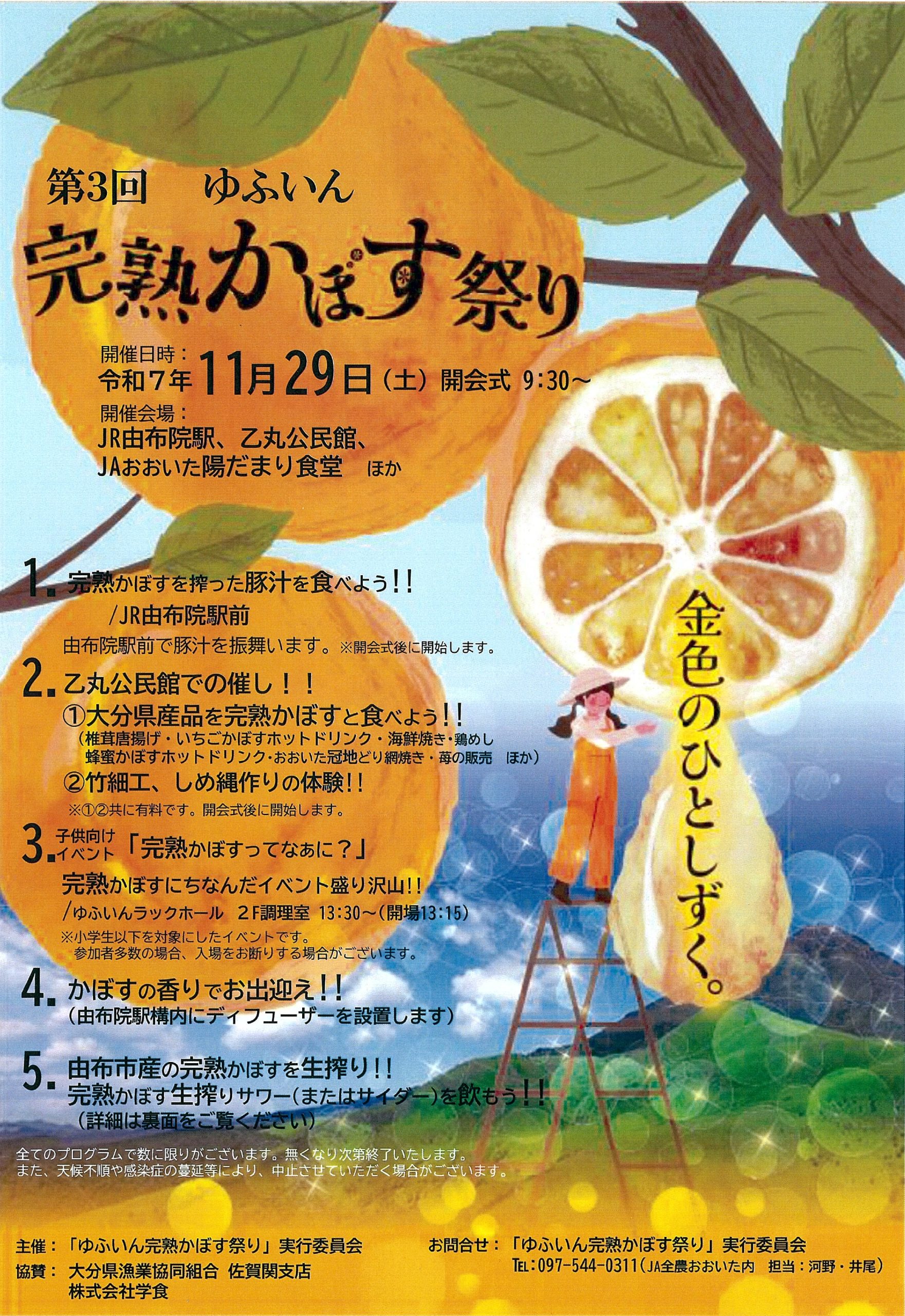 | 問い合わせ先 | 「ゆふいん完熟かぼす祭り」実行委員会 電話:097-544-0311(JA全農おおいた内) |