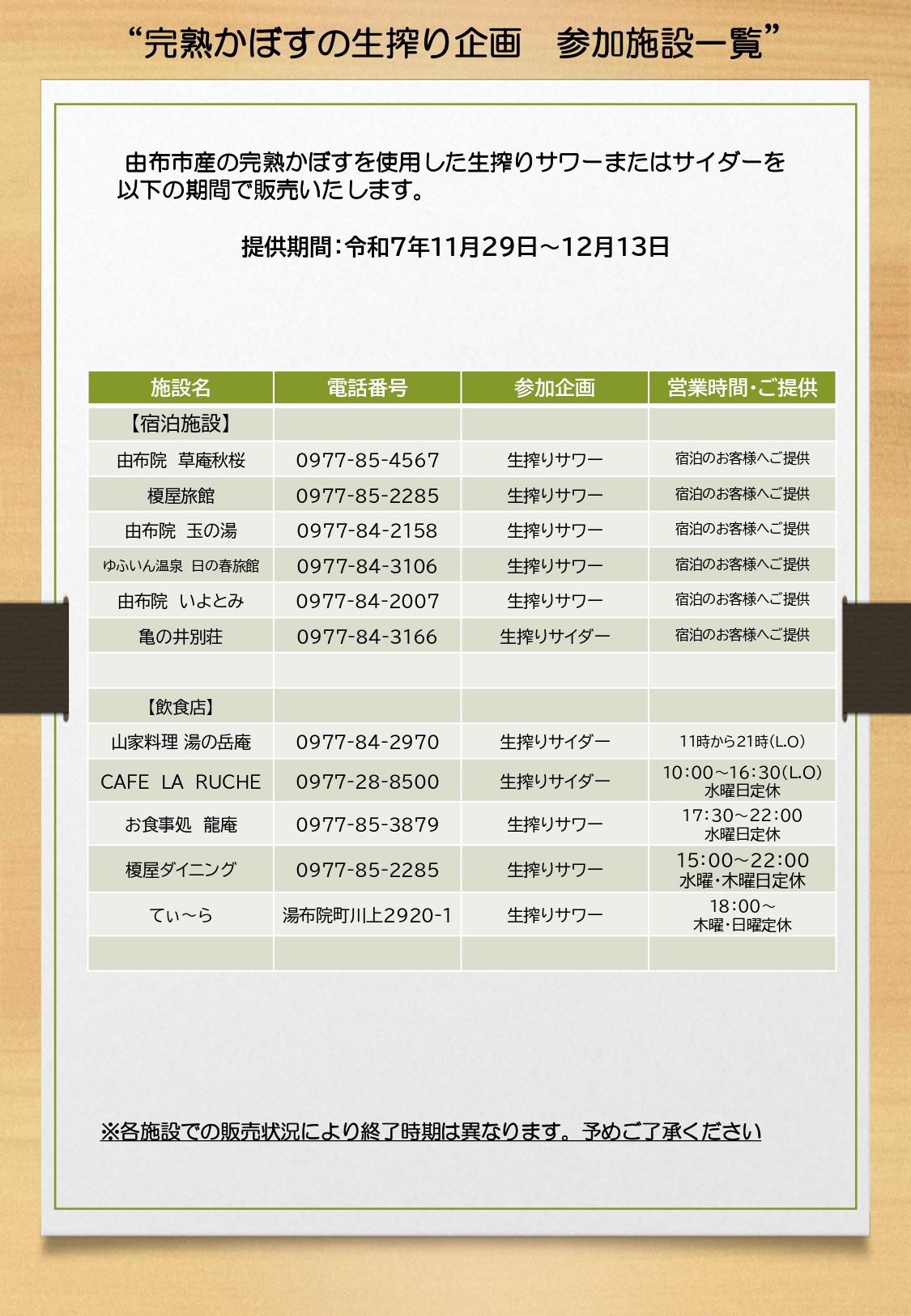 問い合わせ先 「ゆふいん完熟かぼす祭り」実行委員会 電話:097-544-0311(JA全農おおいた内)